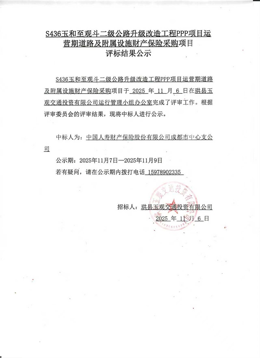 S436玉和至观斗二级公路升级改造工程PPP项目运营期道路及附属设施财产保险采购结果公示
