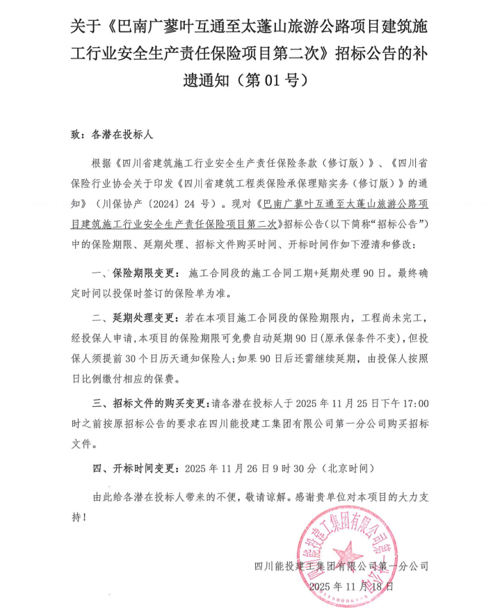 关于《巴南广蓼叶互通至太蓬山旅游公路项目建筑施工行业安全生产责任保险项目第二次》招标公告的补遗通知(第01号)