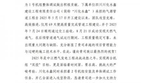 8月23日上午,随着中江燃气发电工程一号机组一次性点火成功,标志着由四川能投建工集团永鑫公司牵头承建的配套项目气源管道工程圆满完成了建设任务,为机组按计划发电上网奠定了坚实基...[详情]