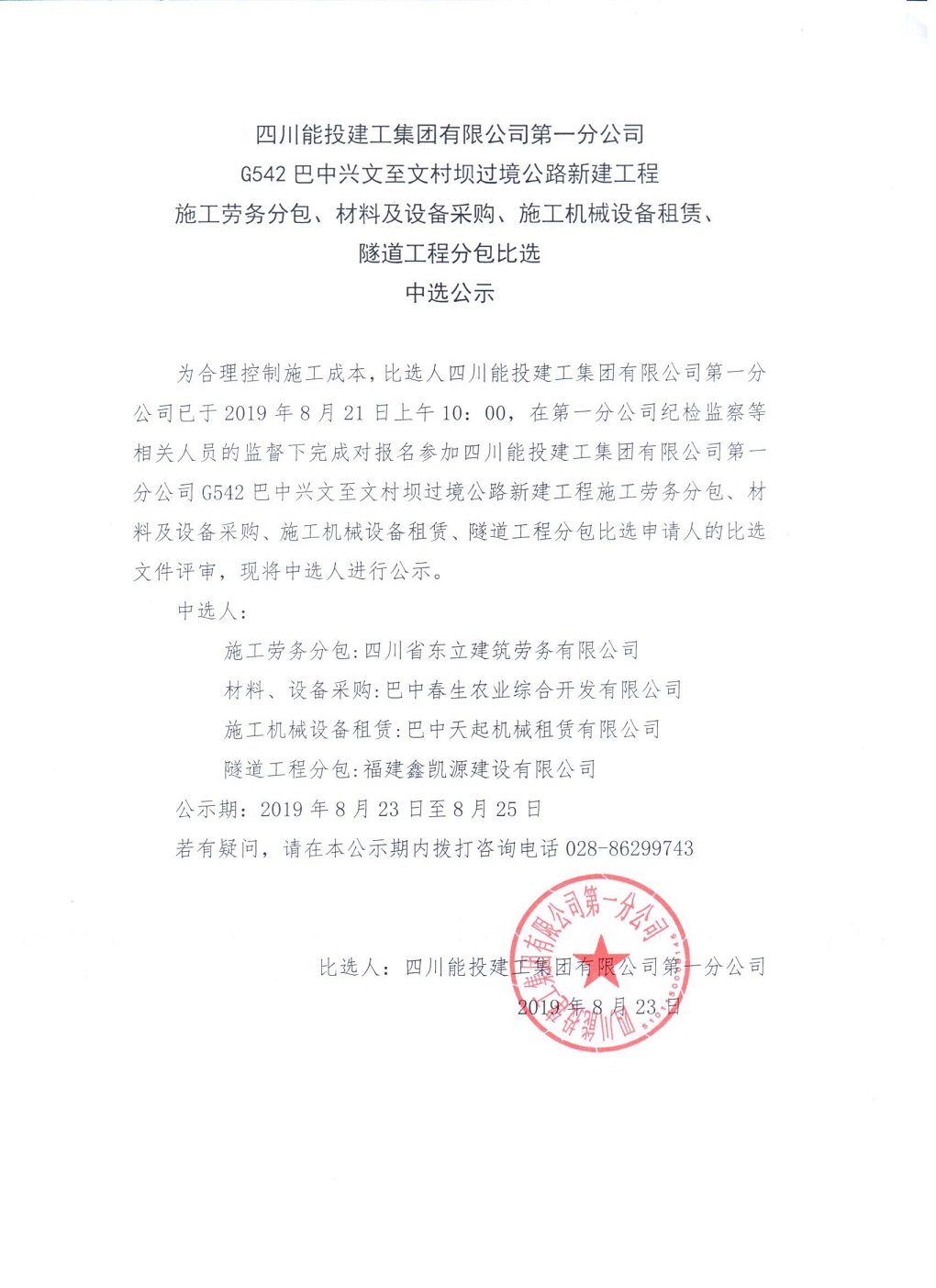 G542巴中兴文至文村坝过境公路新建工程施工劳务分包等比选中选公示