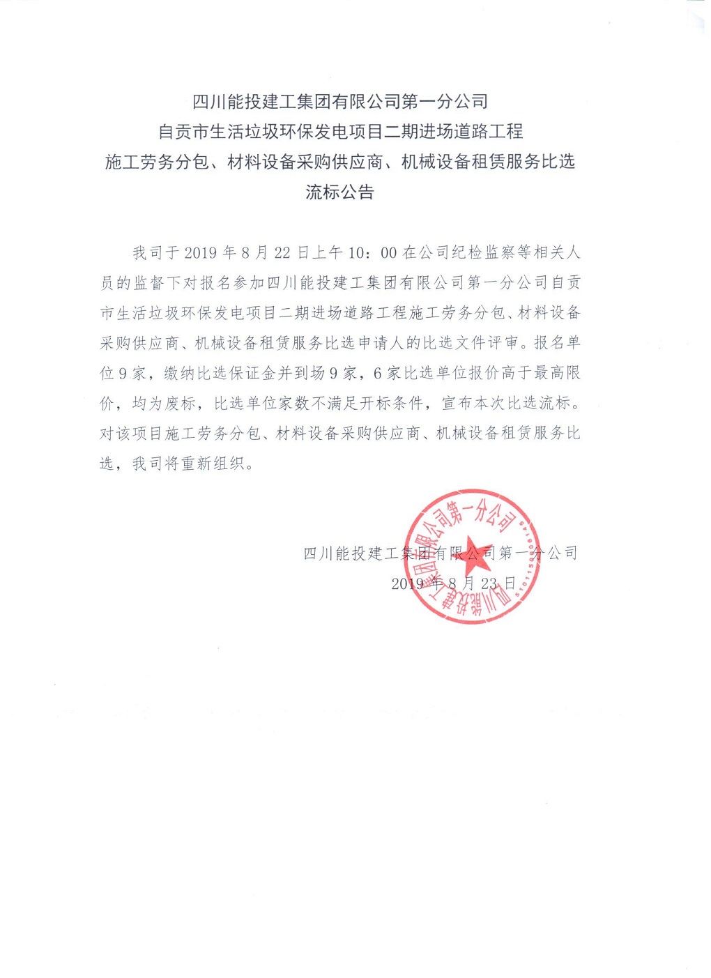 自贡市生活垃圾环保发电项目二期进场道路工程施工劳务分包等比选流标公告