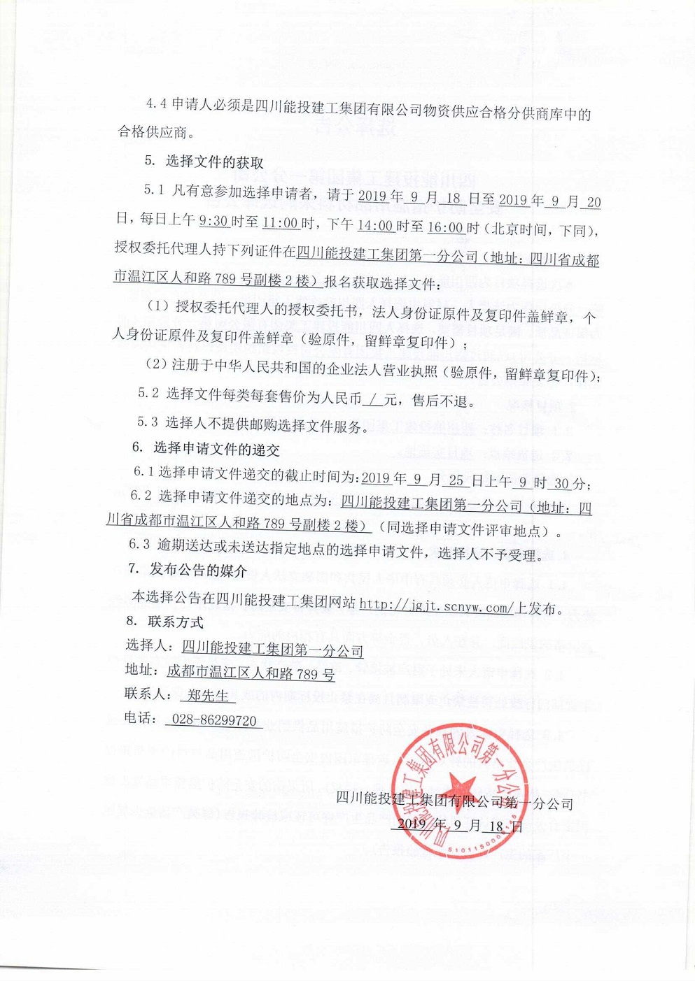 四川能投建工集团第一分公司安全防护措施用品材料采购选择公告