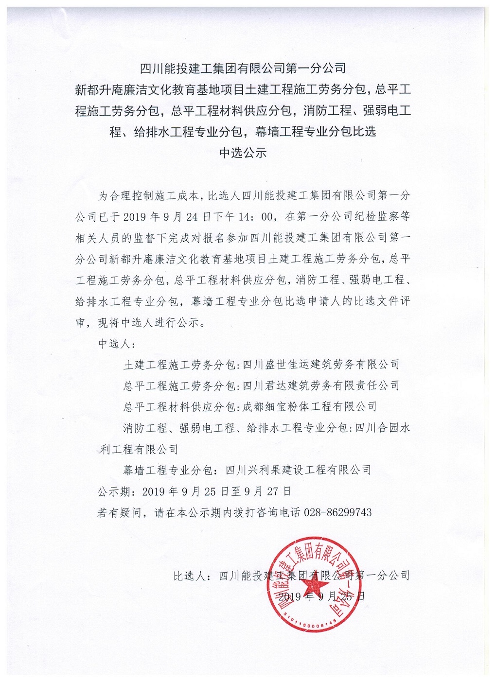 新都升庵洁文化教育基地项目土建工程施工劳务分包、总平工程施工劳务分包等比选中选公示