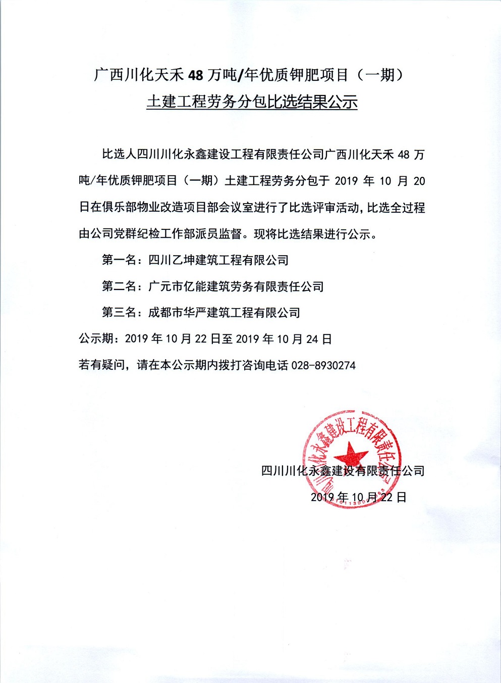 广西川化天禾48万吨/年优质钾肥项目(一期)土建工程劳务分包比选结果公示