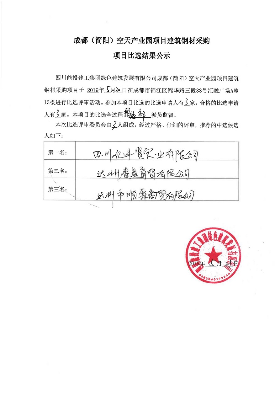 四川能投建工集团绿色建筑发展有限公司建筑钢材采购项目比选结果公示