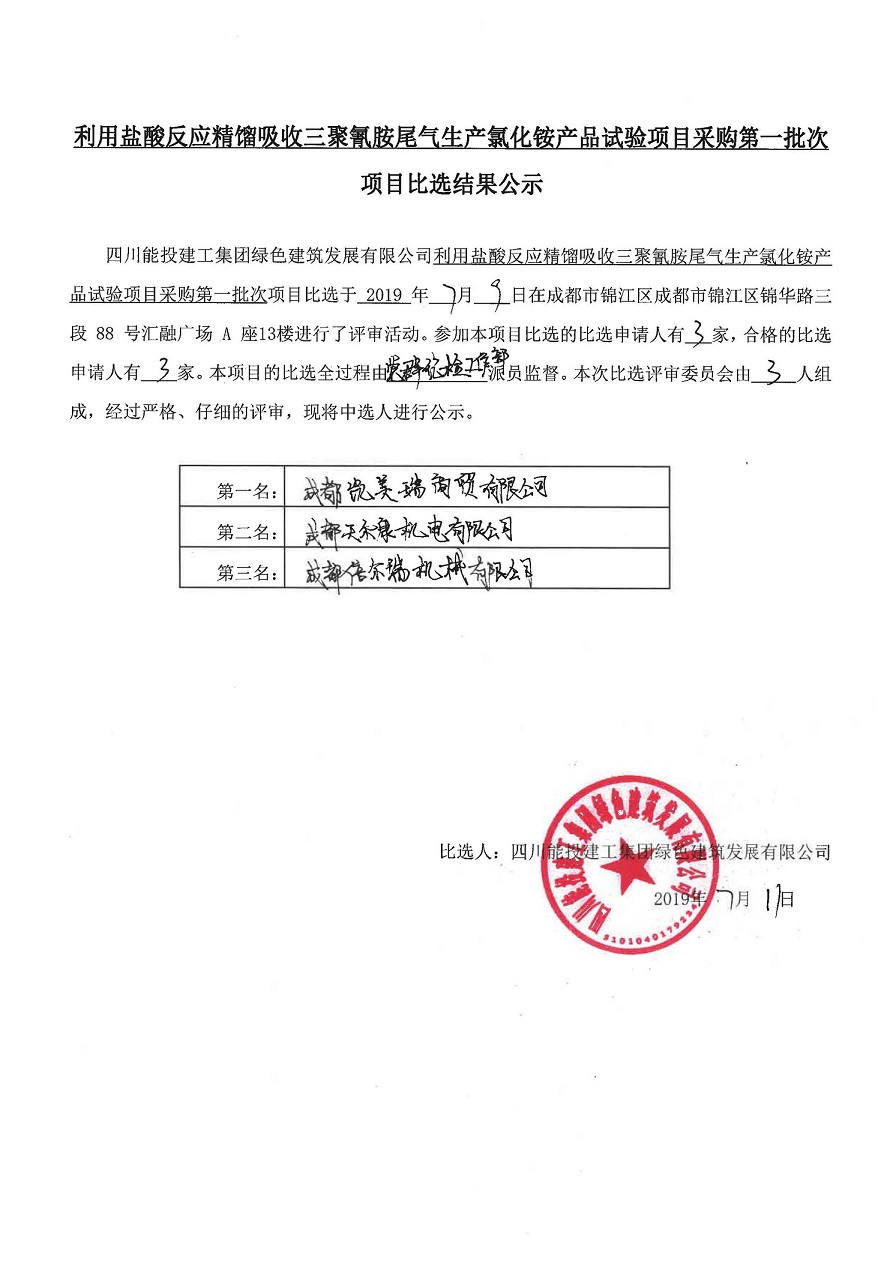 利用盐酸反应精馏吸收三聚氰胺尾气生产氯化铵产品试验项目采购第一批次项目比选结果公示
