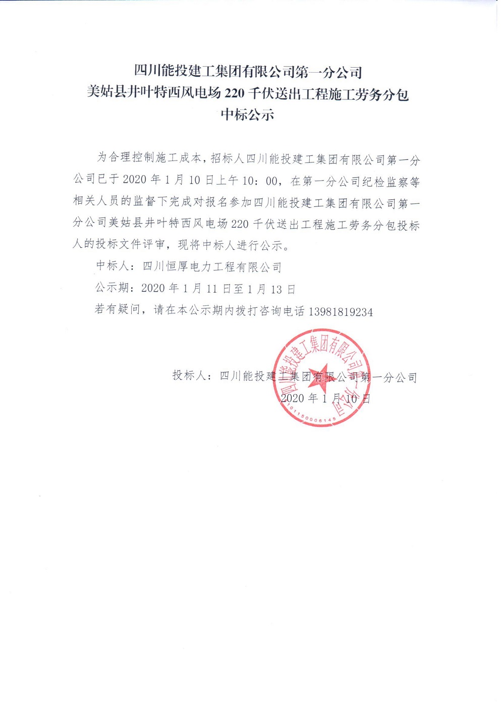 美姑县井叶特西风电场220千伏送出工程施工劳务分包中标公示