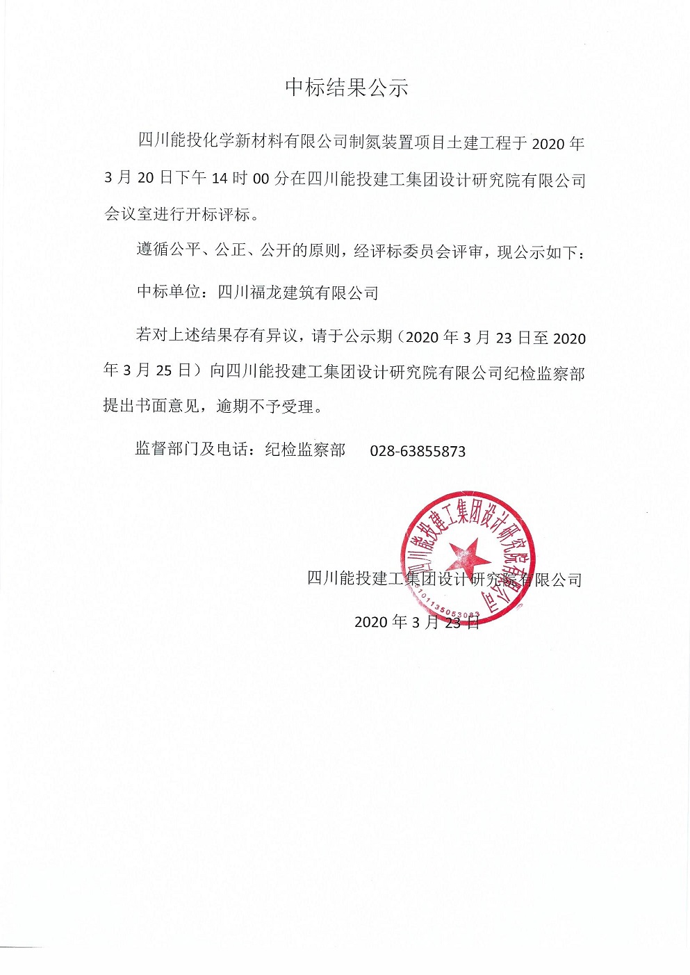 四川能投化学新材料有限公司制氮装置项目土建工程中标结果公示