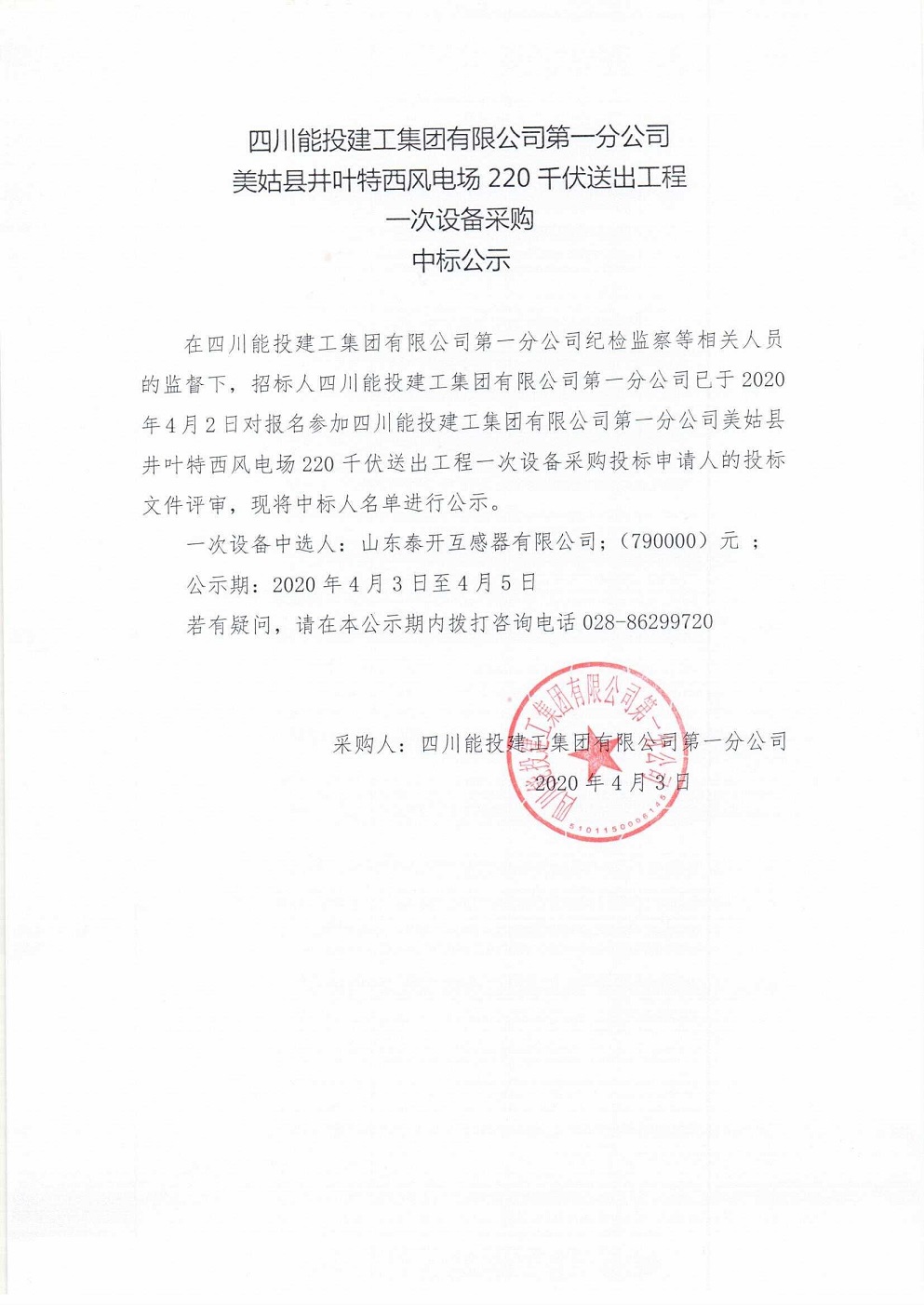 美姑县井叶特西风电场220千伏送出工程一次设备采购中标公示