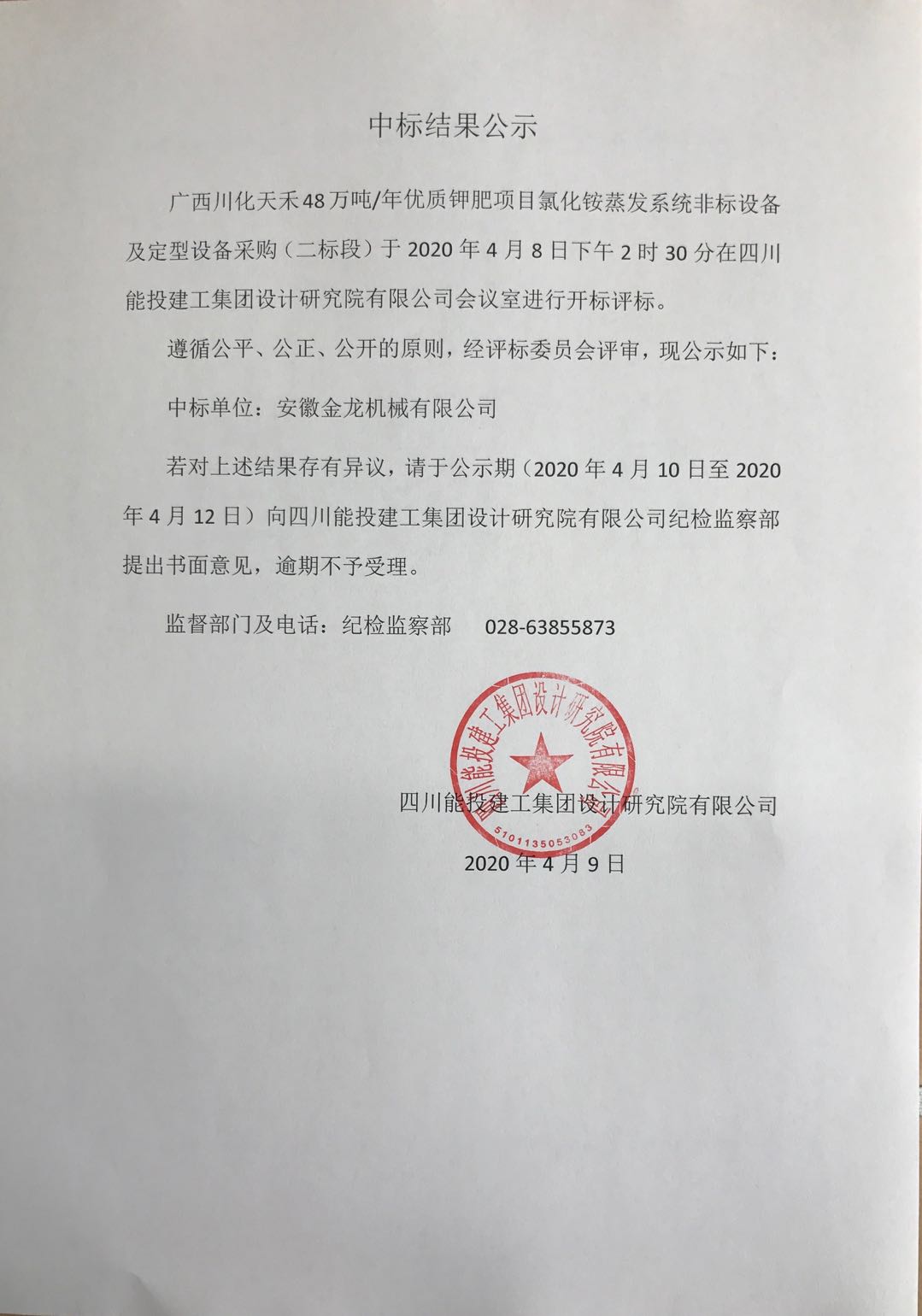 广西川化天禾48万吨/年优质钾肥项目氯化铵蒸发系统非标设备及定型设备中标结果公示