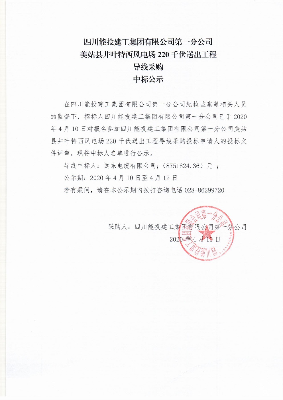 美姑县井叶特西风电场220千伏送出工程导线采购中标公示