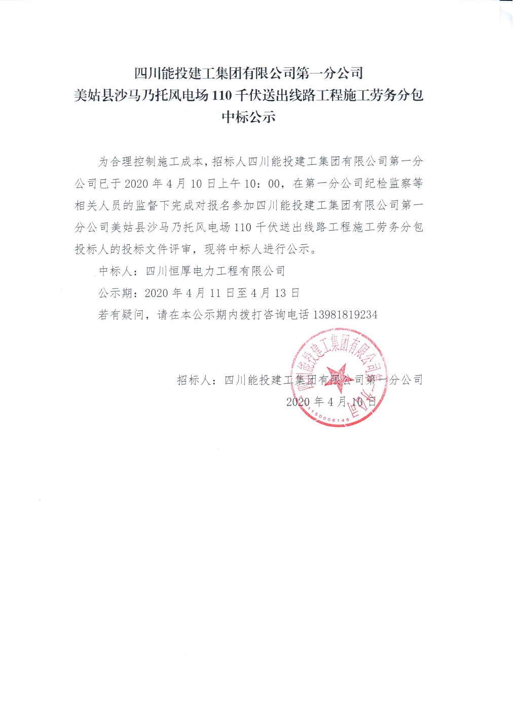 美姑县沙马乃拖风电场110千伏送出线路施工劳务分包中标公示