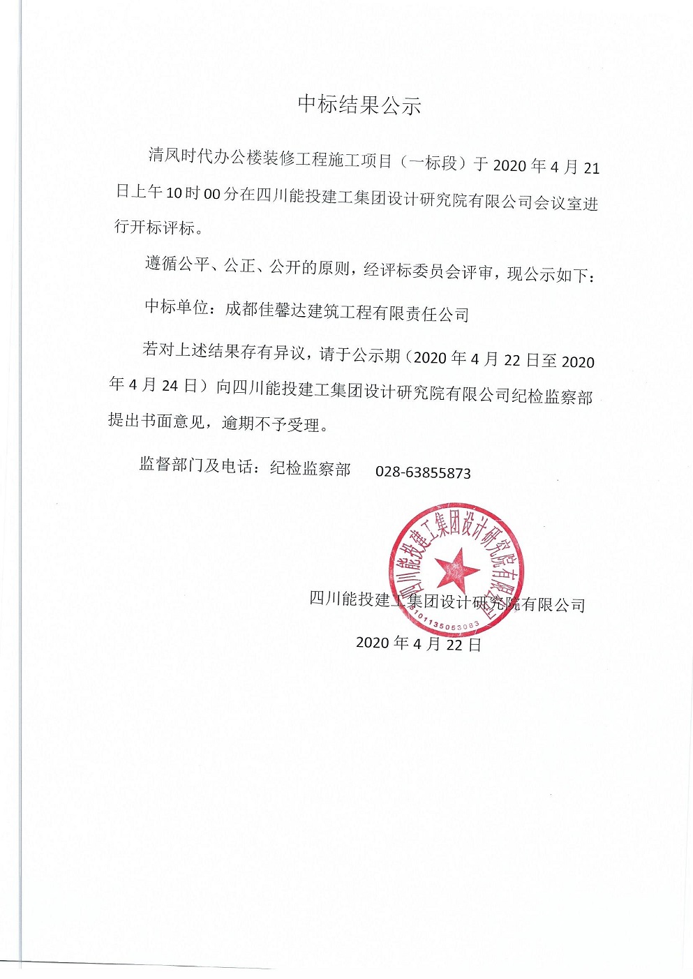 清凤时代办公楼装修工程施工项目招标结果公示