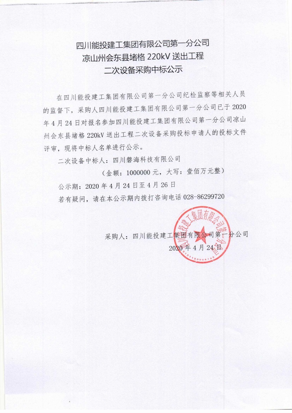 凉山州会东县220kV送出工程二次设备采购中标公示