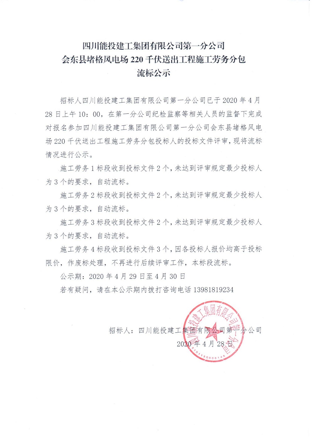 会东堵格风电场送出工程劳务分包流标公示