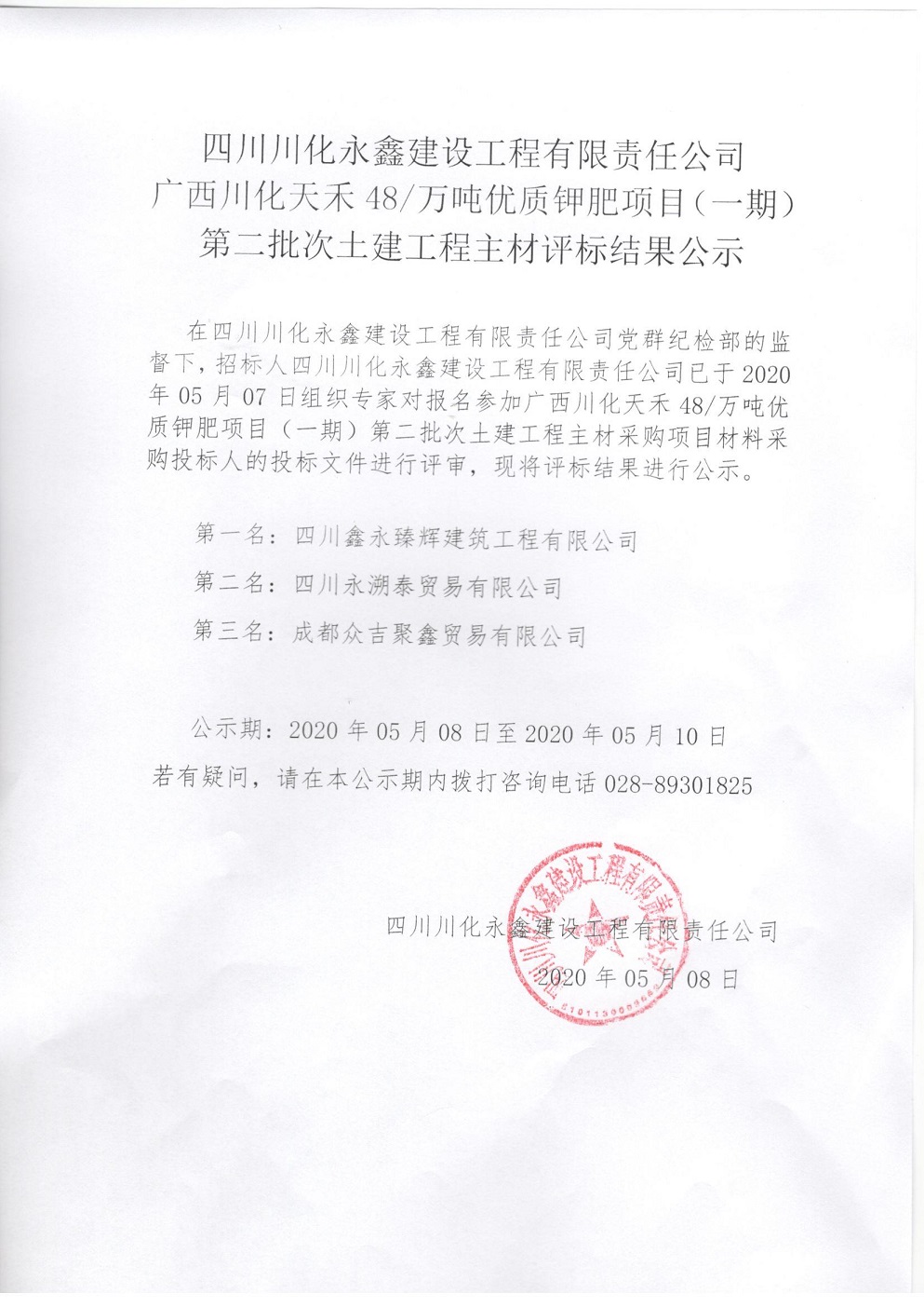 广西川化天禾48万吨年优质钾肥项目(一期)第二批次土建工程主材采购评标结果公示