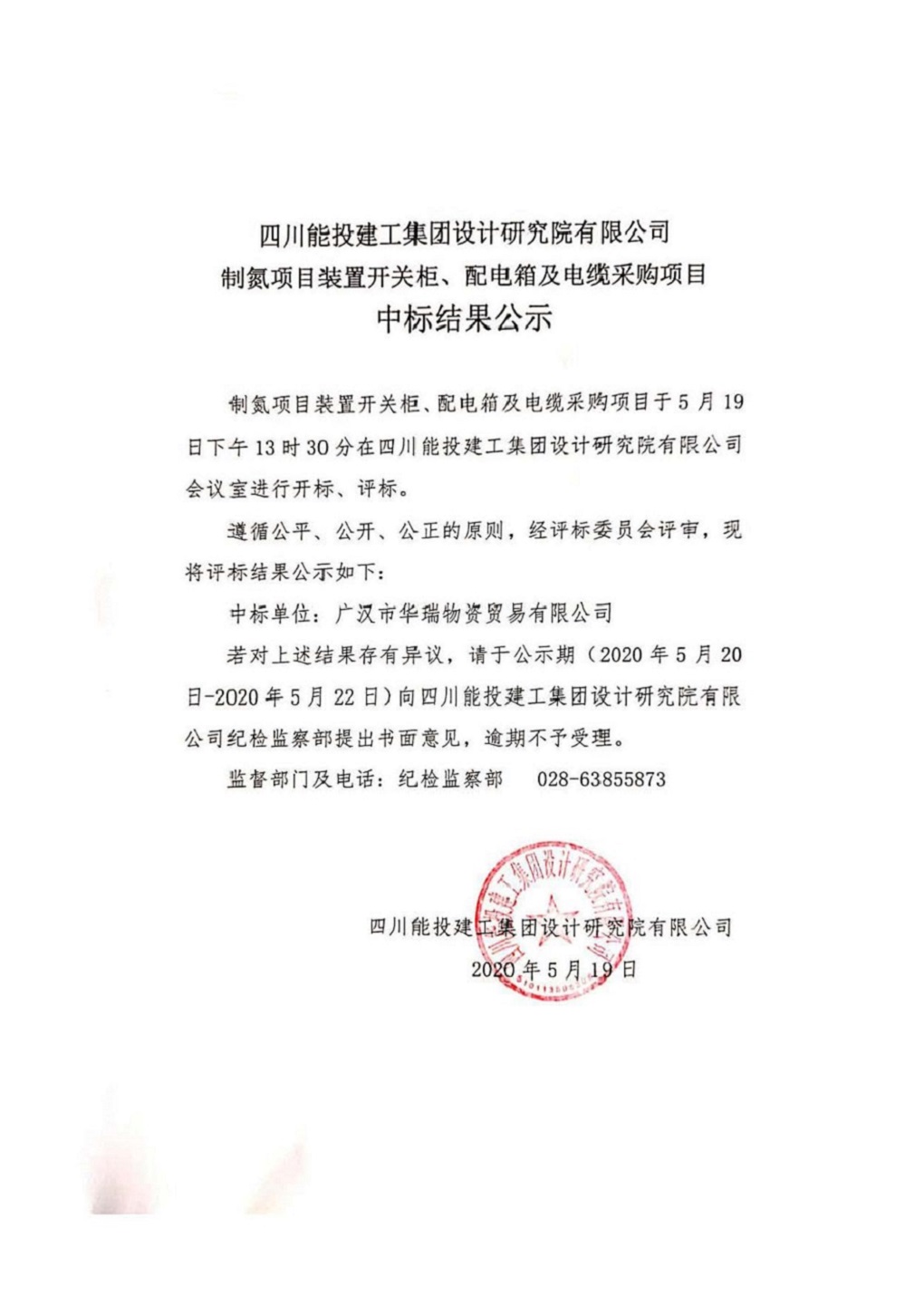 制氮项目装置开关柜、配电箱及电缆采购项目中标结果公示