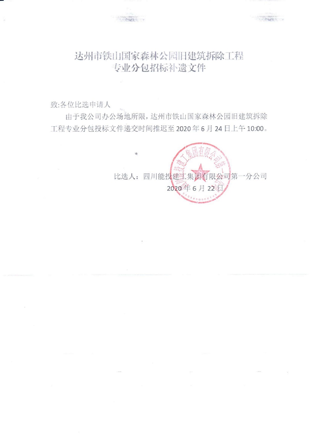 达州市铁山国家森林公园旧建筑拆除工程专业分包招标补遗文件
