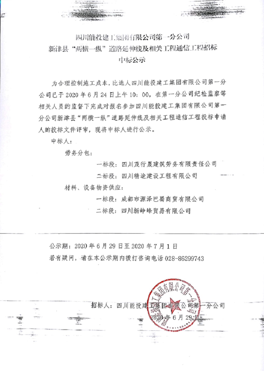 新津县“两横一纵”道路延伸线及相关工程通信工程招标中标公示