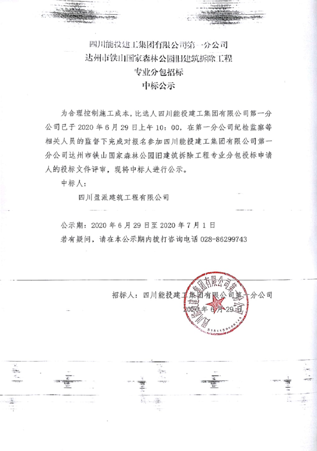 达州市铁山国家森林公园旧建筑拆除工程专业分包招标中标公示