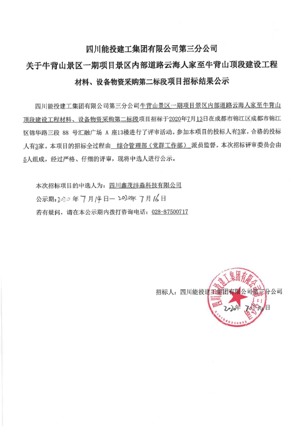 四川省能投会东新能源开发有限公司2020年度输电线路运行维护工程施工劳务分包招标中标公示