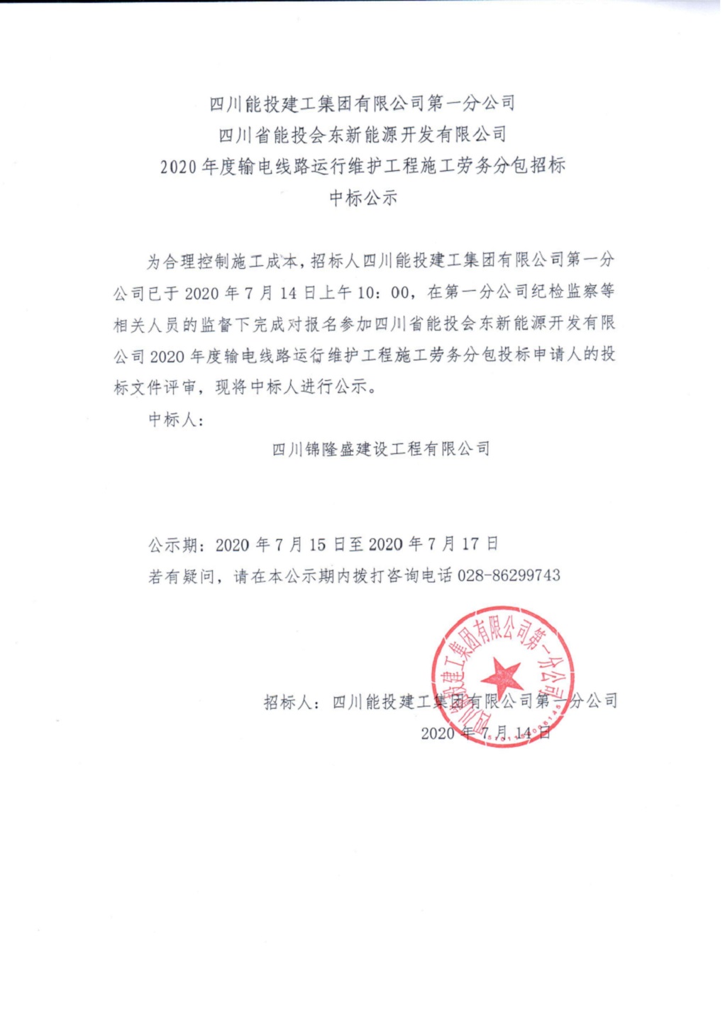 四川省能投会东新能源开发有限公司2020年度输电线路运行维护工程施工劳务分包招标中标公示