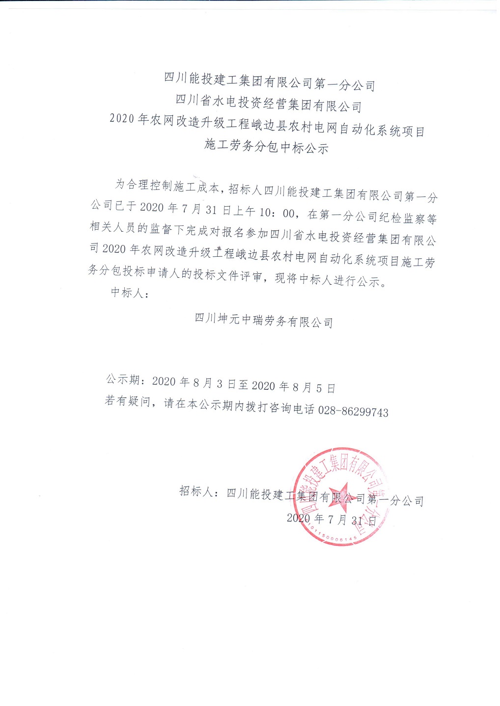 四川省水电投资经营集团有限公司2020年农网改造升级工程峨边县农村电网自动化系统项目施工劳务分包中标公示