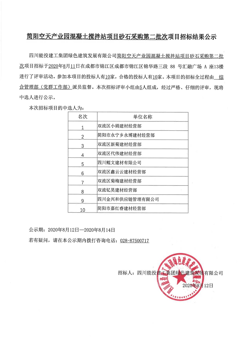 简阳空天产业园混凝土搅拌站项目砂石采购第二批次项目招标结果公示