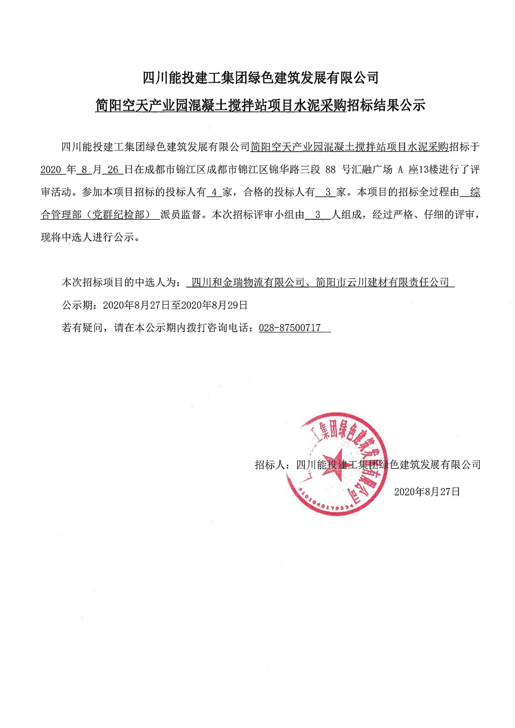 简阳空天产业园混凝土搅拌站项目水泥采购招标结果公示