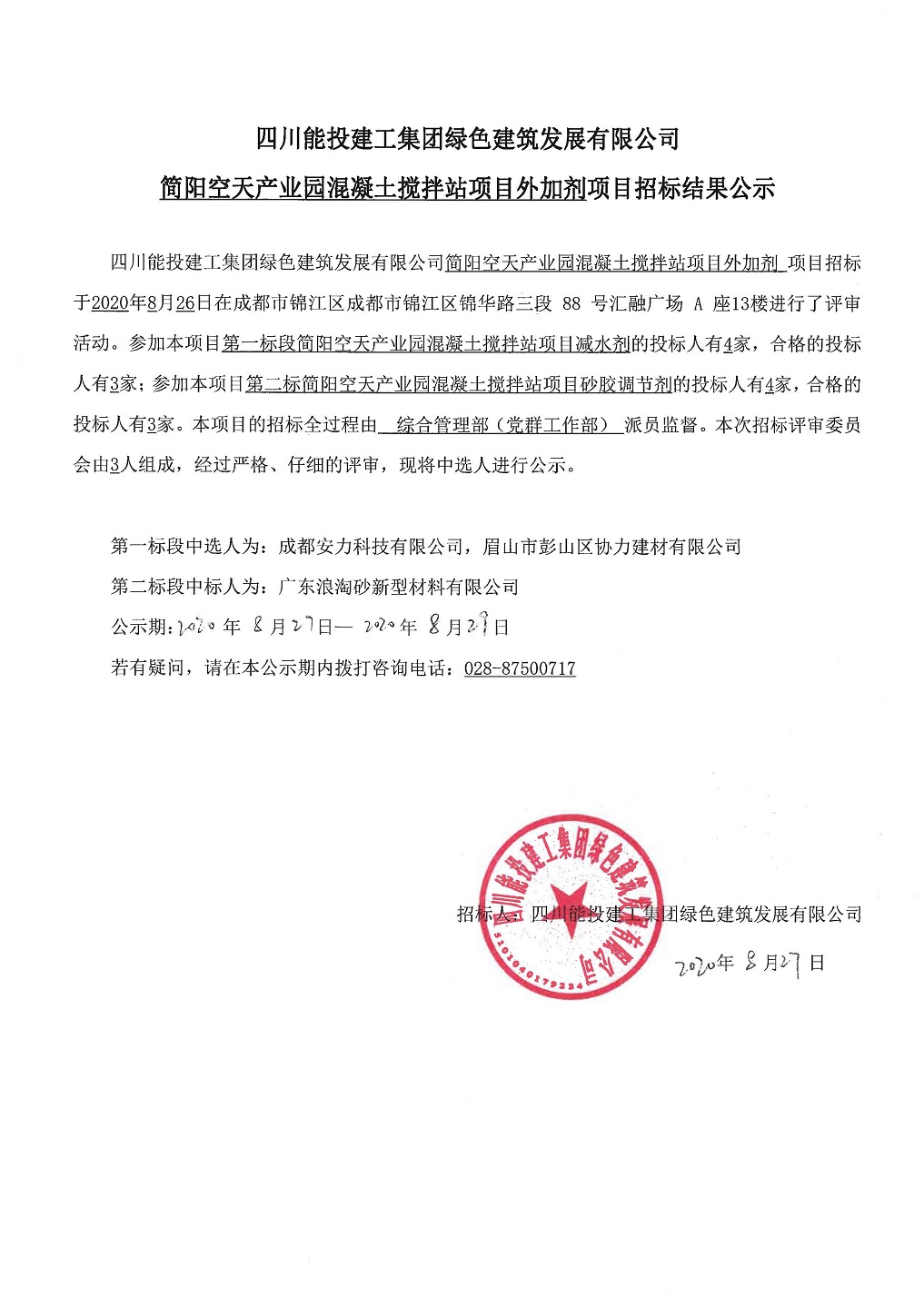 简阳空天产业园混凝土搅拌站项目外加剂项目招标结果公示
