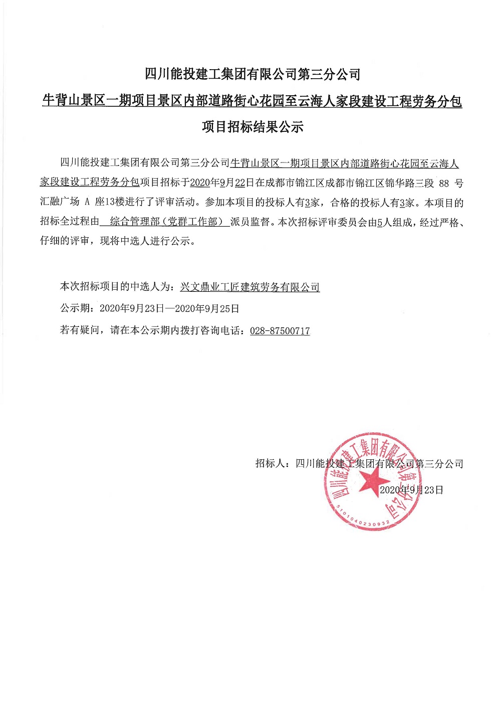 街心花园至云海人家段建设工程劳务分包项目结果公示