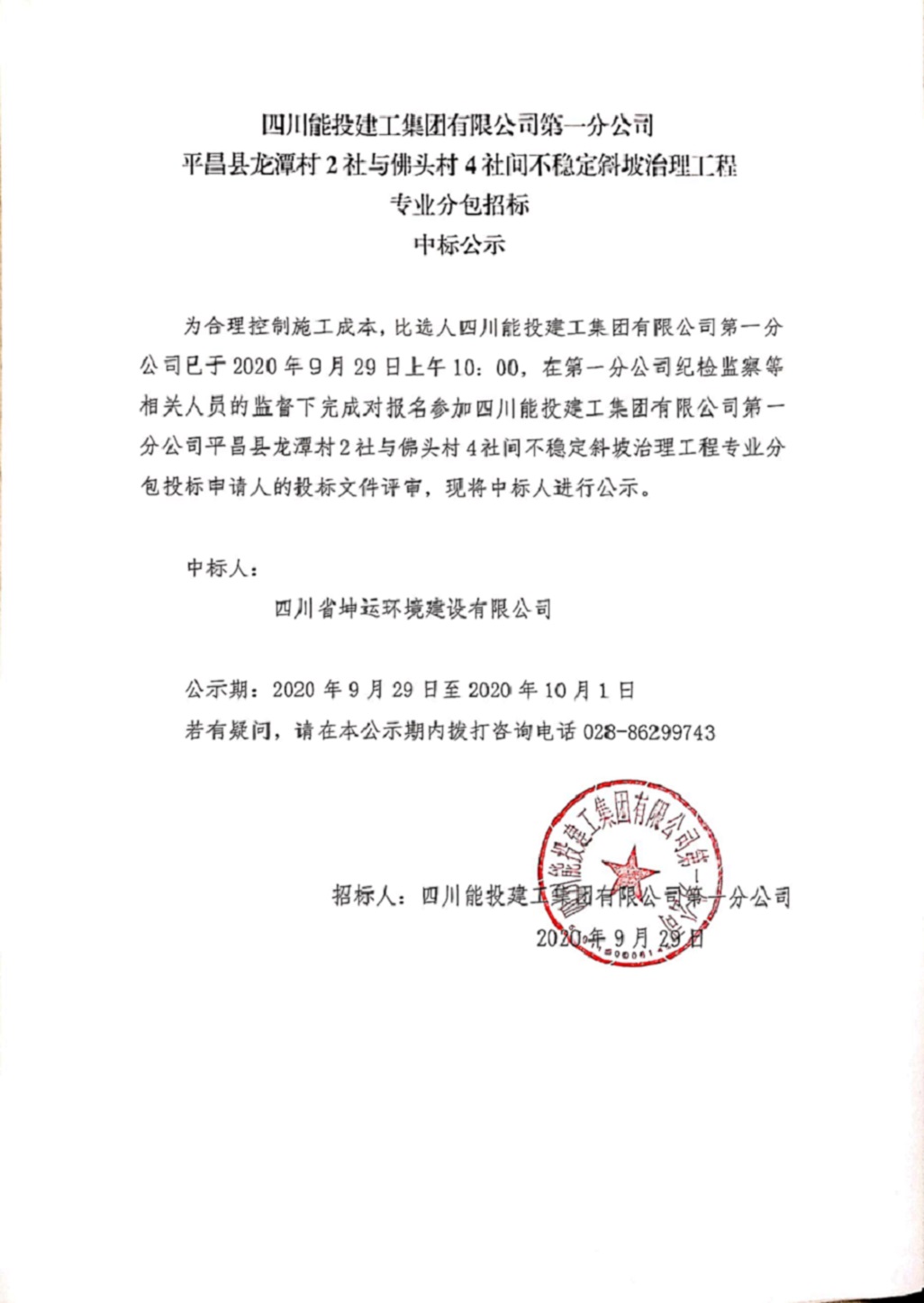 平昌县龙潭村2社与佛头村4社间不稳定斜坡治理工程专业分包招标中标公示