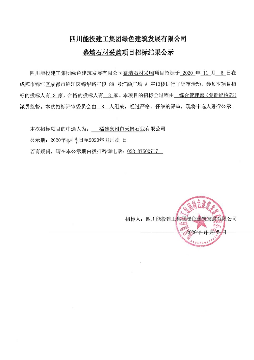 幕墙石材采购招标结果公示