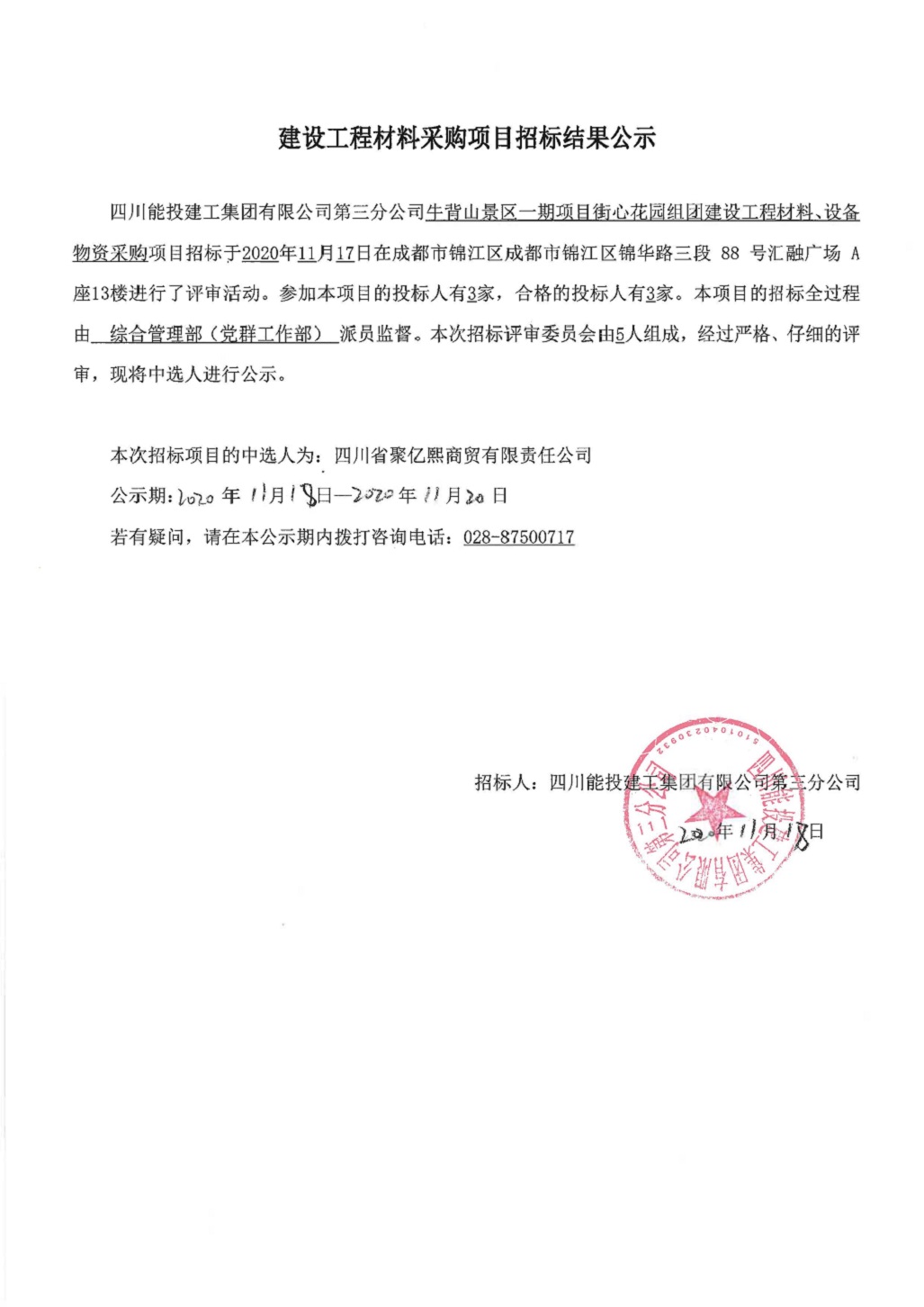 建设工程材料采购招标结果公示