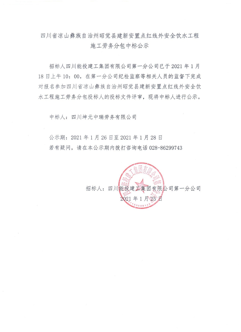 四川省凉山彝族自治州昭觉县建新安置点红线外安全饮水工程施工劳务分包中标公示