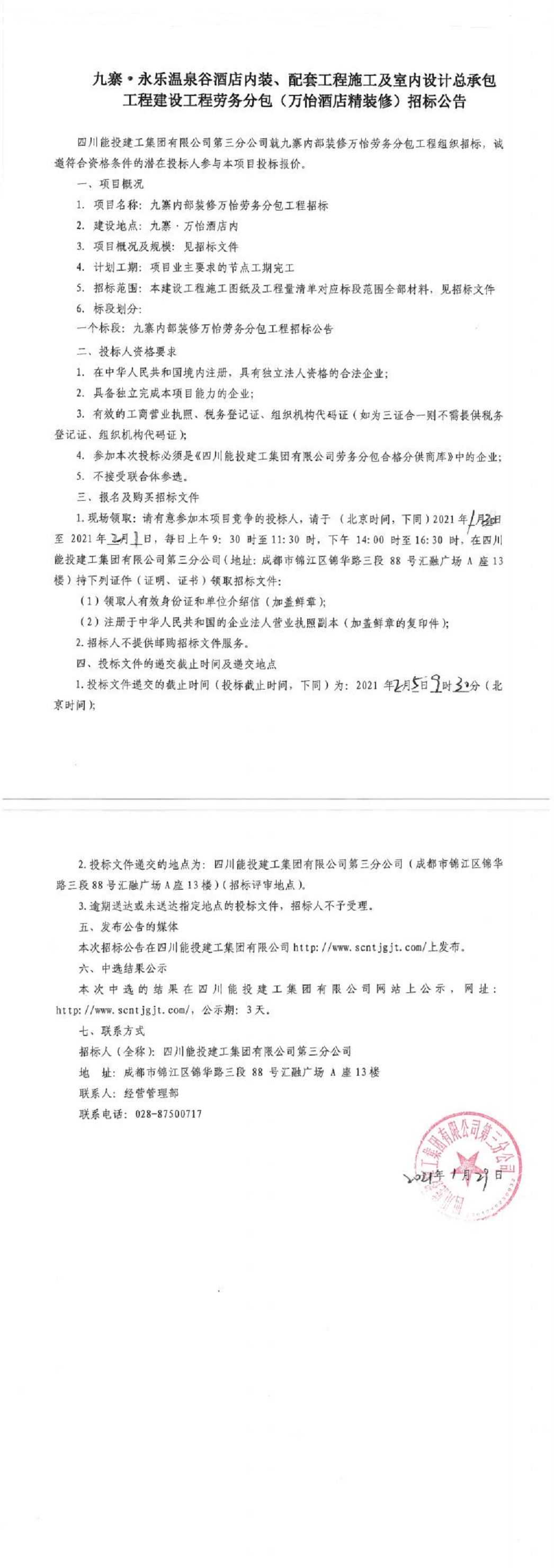 九寨.永乐温泉谷酒店内装、配套工程施工及室内设计总承包工程建设工程劳务分包(万怡酒店精装修)招标公告