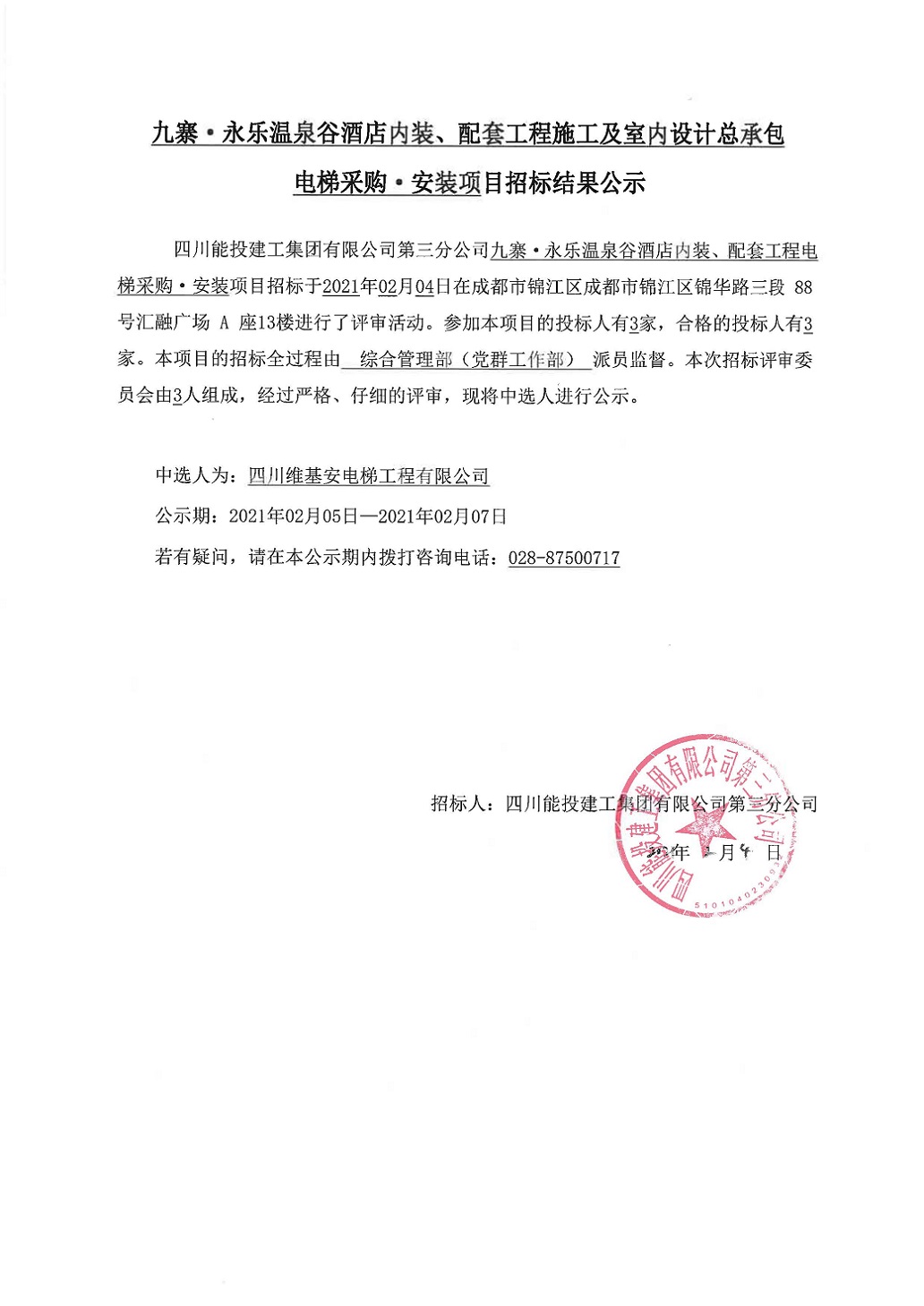 九寨.永乐温泉谷酒店内装、配套工程施工及室内设计总承包工程电梯采购.安装专业分包招标结果公示
