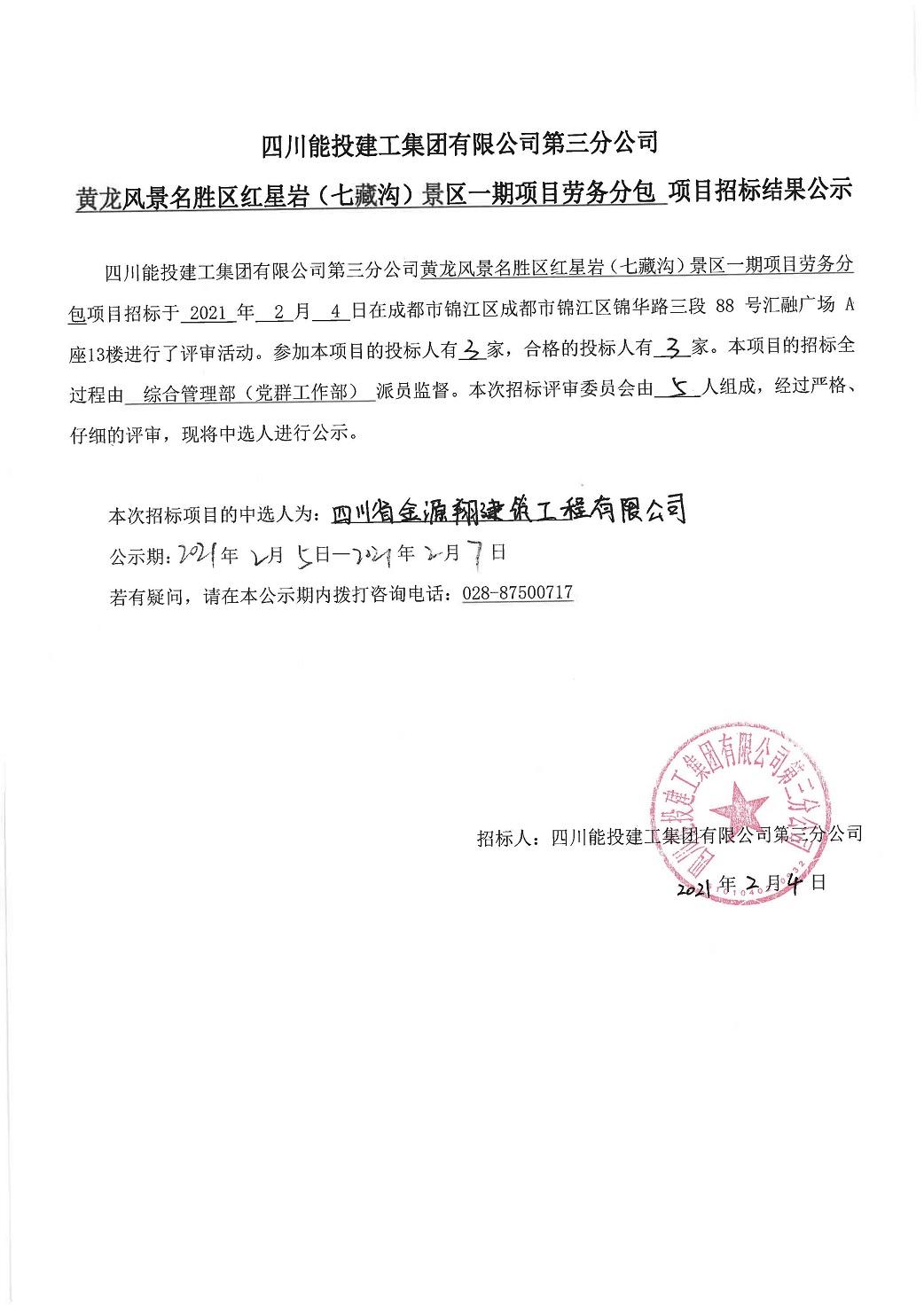 劳务分包招标结果公示