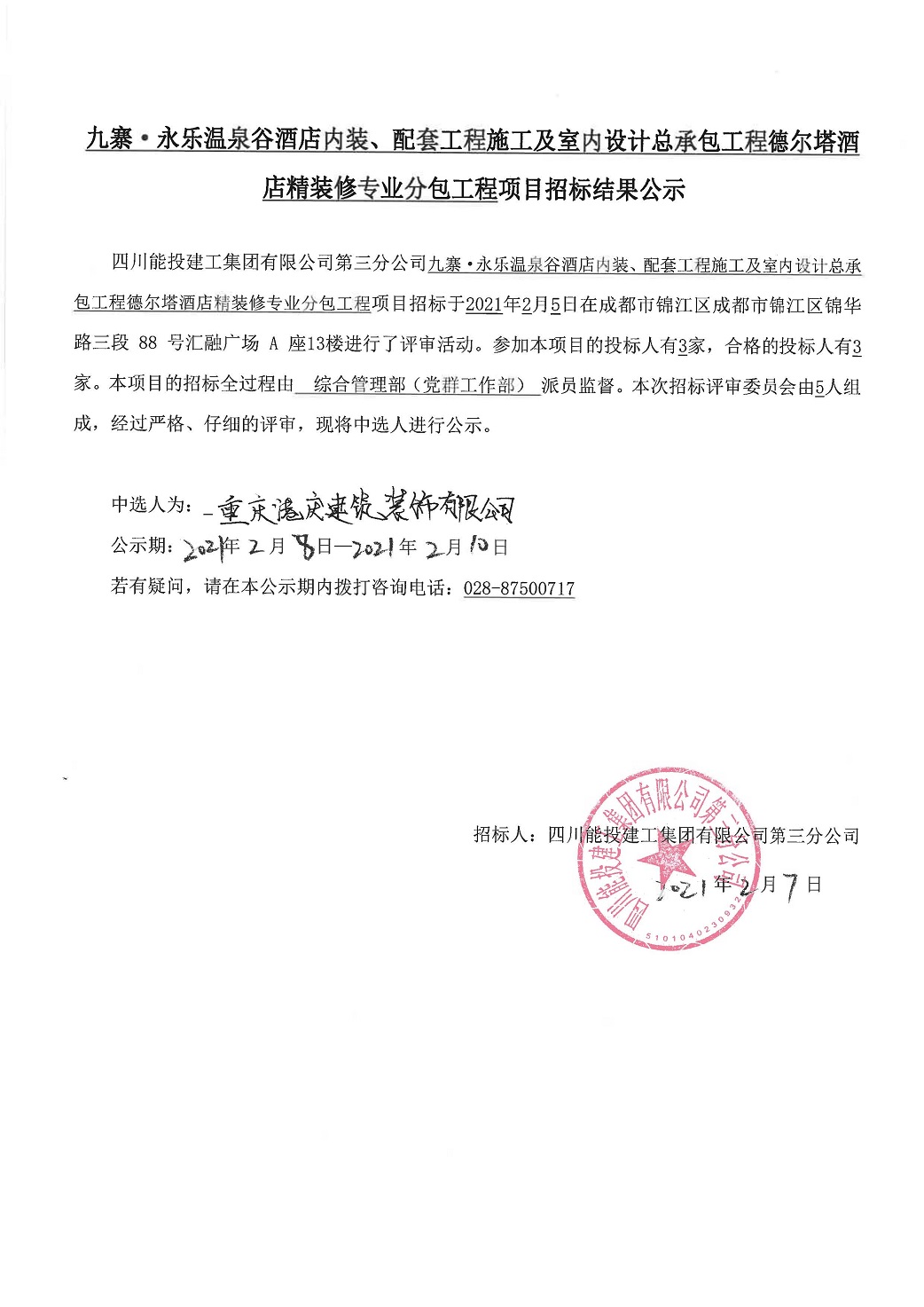 九寨.永乐温泉谷酒店内装、配套工程施工及室内设计总承包工程德尔塔酒店精装修专业分包工程招标结果公示