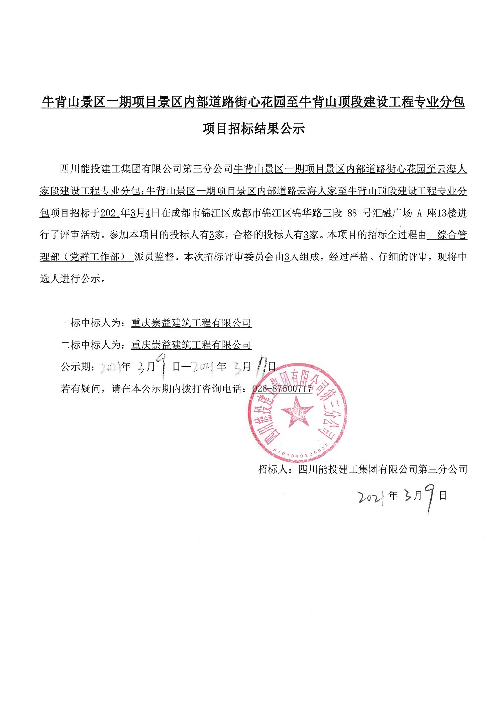 牛背山景区一期项目景区内部道路街心花园至牛背山顶段建设工程专业分包招标结果公示