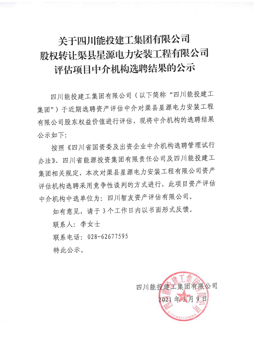 关于乐动网页版股权转让渠县星源电力安装工程有限公司评估项目中介机构选聘结果的公示