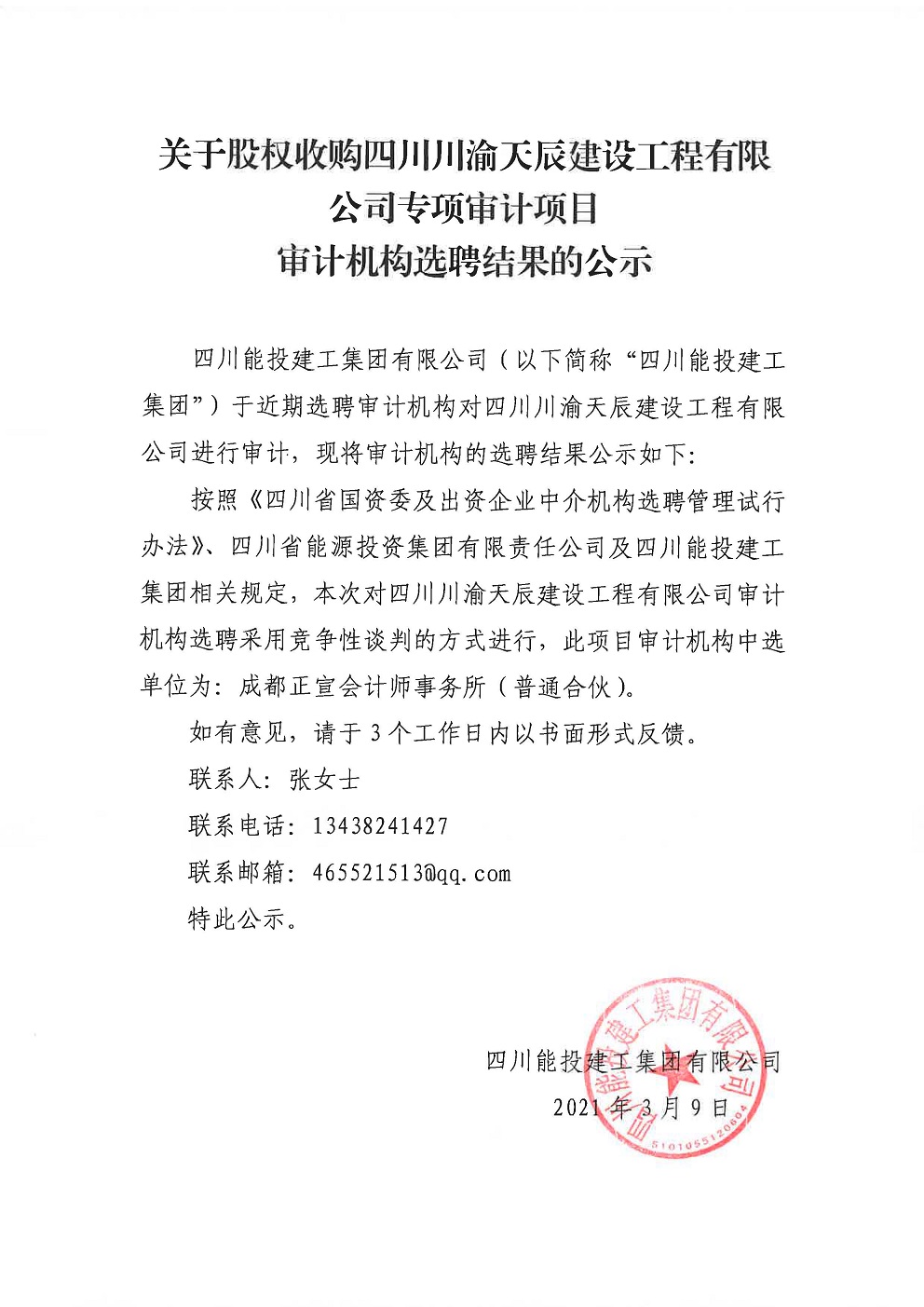关于股权收购四川川渝天辰建设工程有限公司专项审计项目审计机构选聘结果的公示