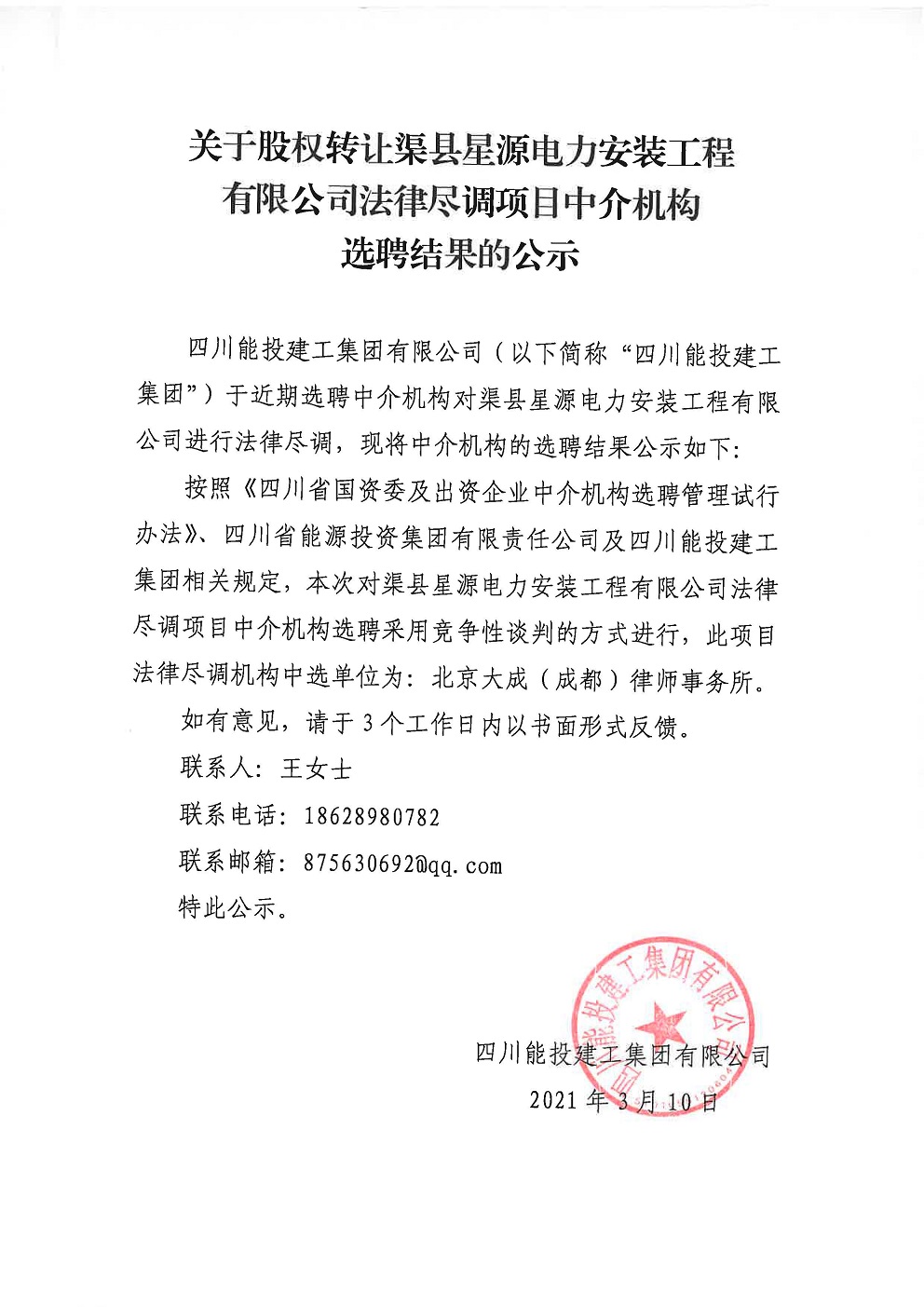 关于股权转让渠县星源电力安装工程有限公司法律尽调项目中介机构选聘结果的公示