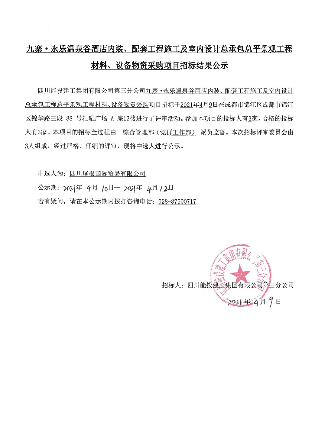 九寨.永乐温泉谷酒店内装、配套工程施工及室内设计总承包工程总平景观工程材料、设备物资采购项目招标结果公示