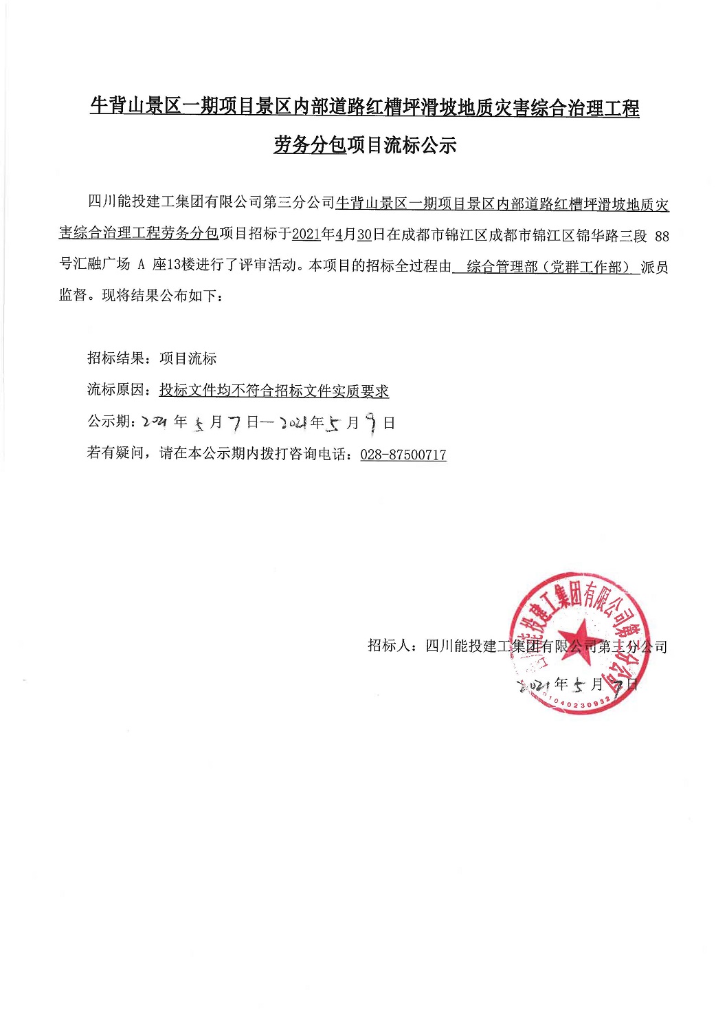牛背山景区一期项目景区内部道路红槽坪滑坡地质灾害综合治理工程劳务分包项目流标公示
