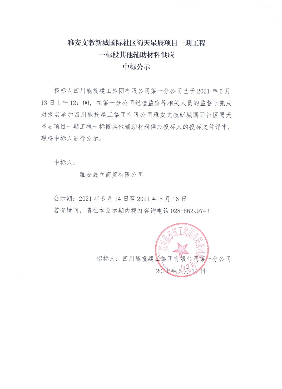 雅安文教新城国际社区蜀天星辰项目一期工程一标段其他辅助材料供应中标公示
