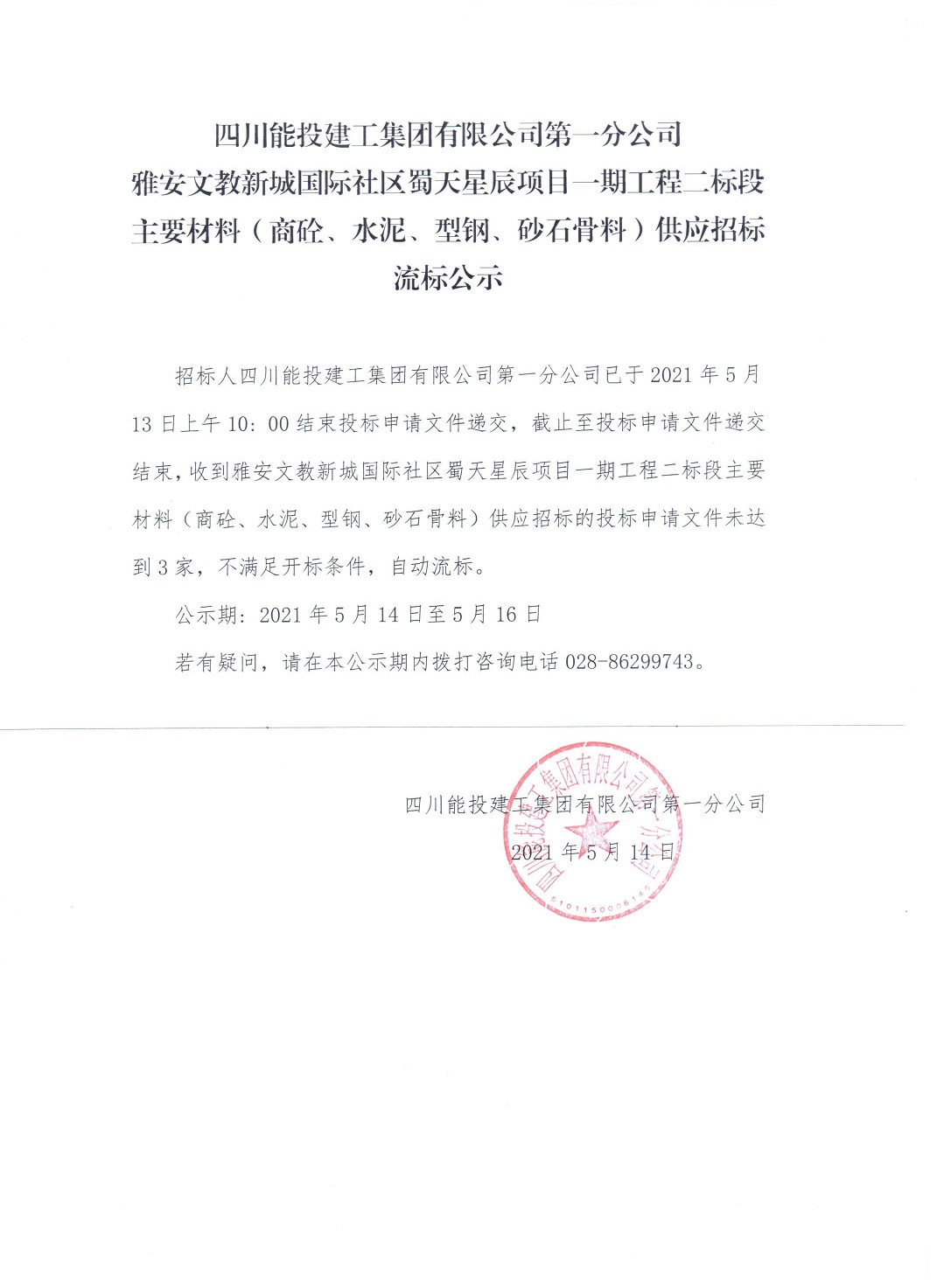雅安文教新城国际社区蜀天星辰项目一期工程二标段主要材料(商砼、水泥、型钢、砂石骨料)供应招标流标公示