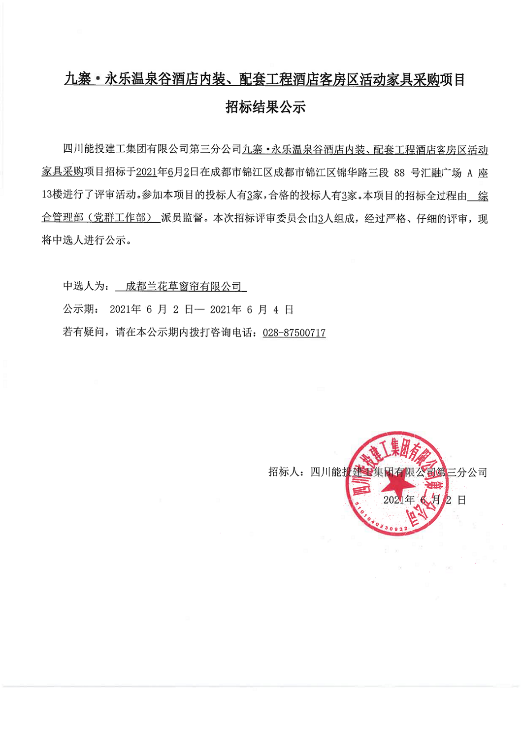 九寨.永乐温泉谷酒店内装、配套工程酒店客房区活动家具采购项目招标结果公示