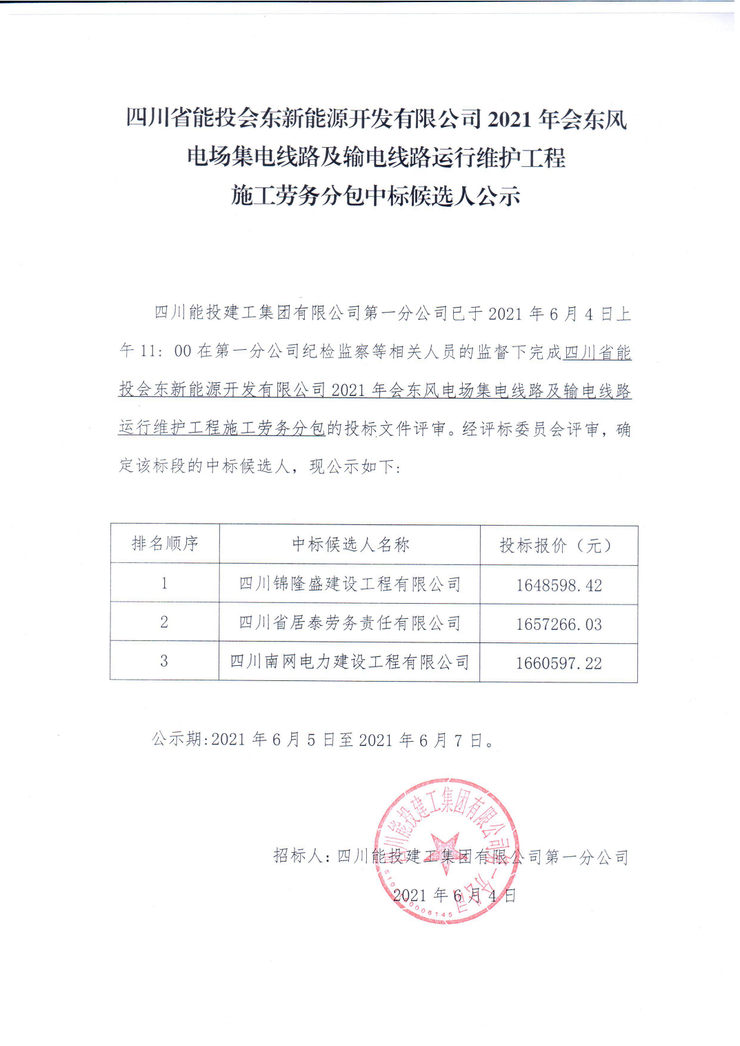 2021年会东风电场集电线路及输电线路运行维护工程施工劳务分包中标候选人公示