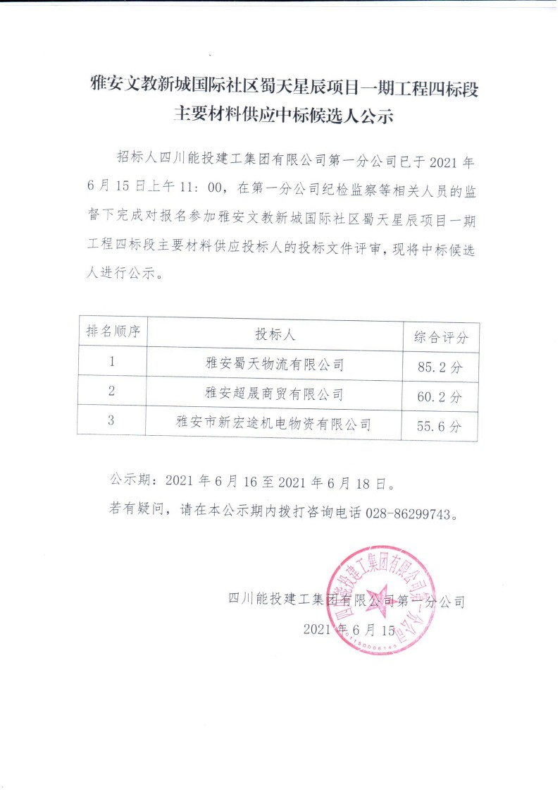 雅安文教新城国际社区蜀天星辰项目一期工程四标段主要材料供应中标候选人公示